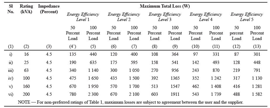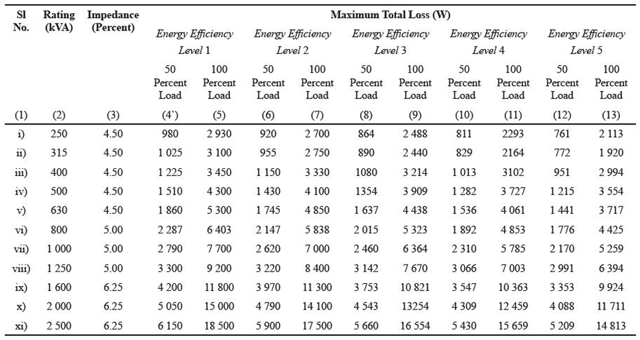 Maximum Total Losses upto 11 kv Class Transformers – Group ‐1